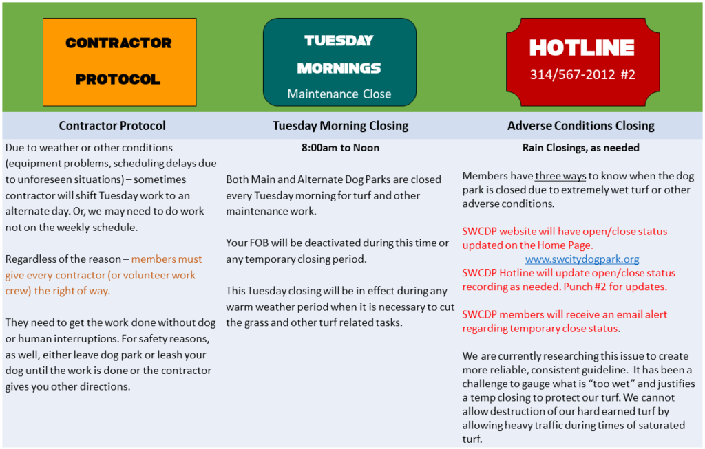SWCDP will always send a notice to alert members of the temporary closing for the pre-emergent application. Usage of any post-emergent will be during the turf renovation period, so the dog park will be closed. No herbicides will be stored at the dog park. Herbicides will be administered by our outside contractor so no SWCDP volunteer will be asked to handle it.