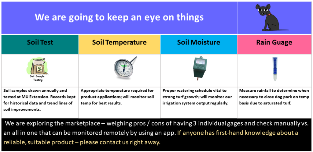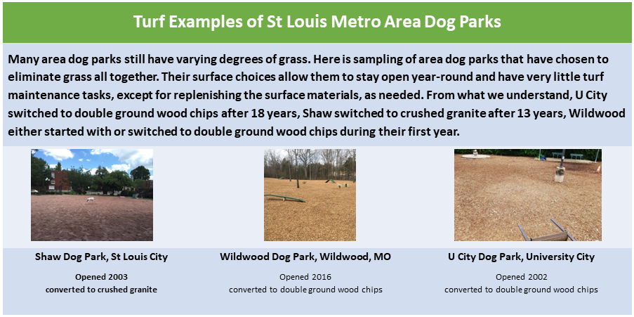 All struggle with turf issues. Like we have said many times – dog parks are in their own universe! From 2016-2018, SWCDP founded and managed a group of St Louis Metro Area Dog Park Managers which included many Municipal Parks Dept Managers as well as volunteers managing City parks. The group met 3-4 times per year, as needed, and a variety of dog park management issues were shared as we all looked for improvement opportunities. Turf management was a constant topic.