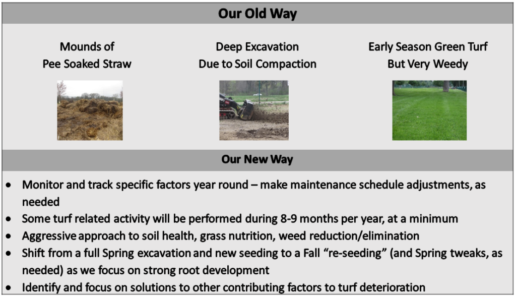 We introduced a similar plan in Spring 2019 but several things developed simultaneously so we opted to delay all decisions for another year. We realized that by only addressing turf improvements (seed, fertilizer, etc) and not addressing all the detrimental factors causing our problems – we were setting ourselves up for disappointment. More time was needed for a comprehensive approach – tied into a Five Year Plan.