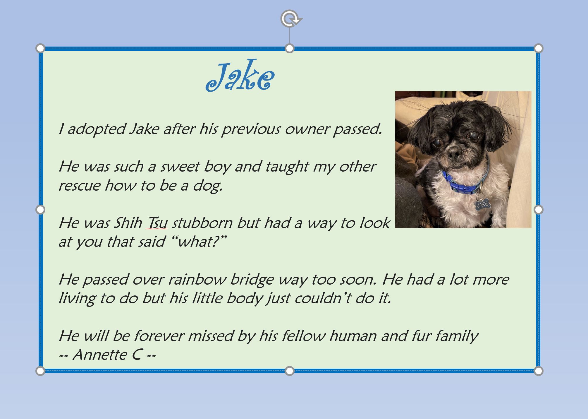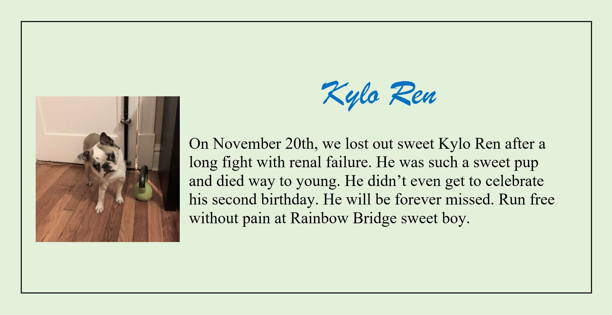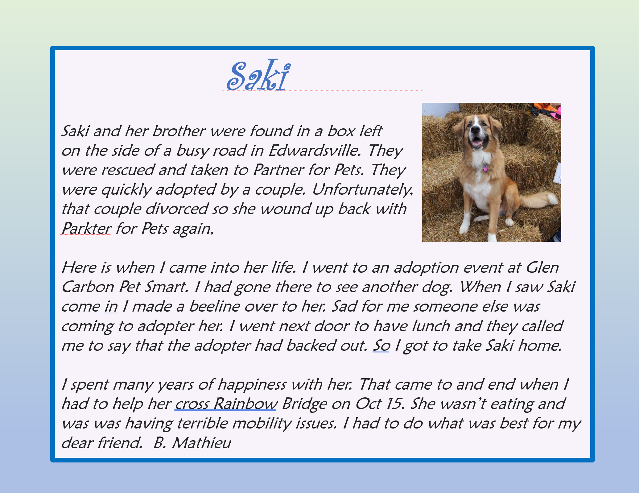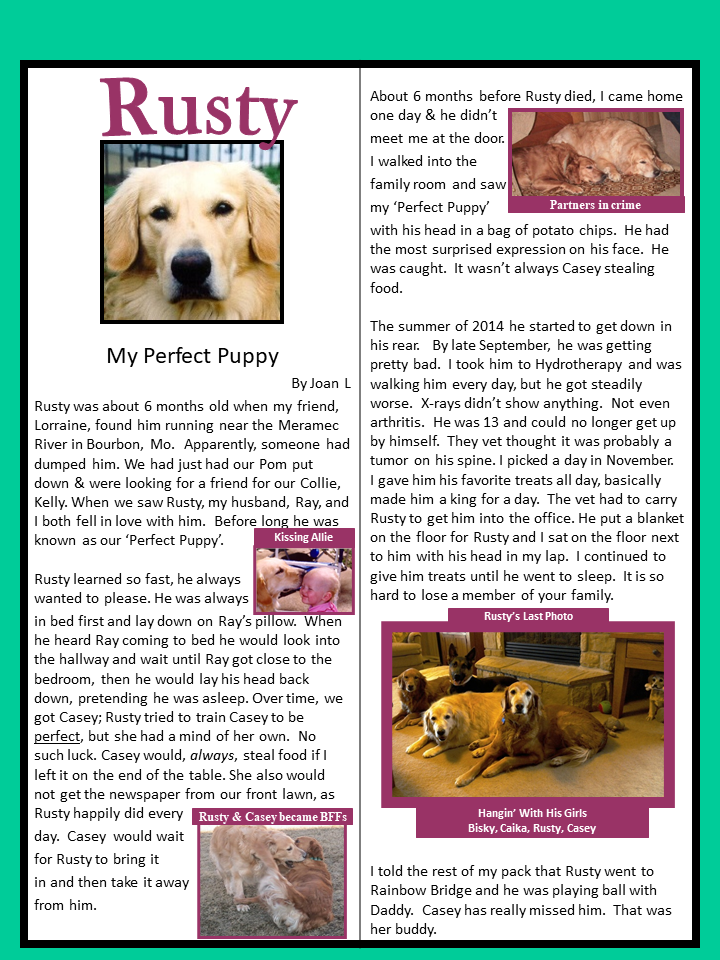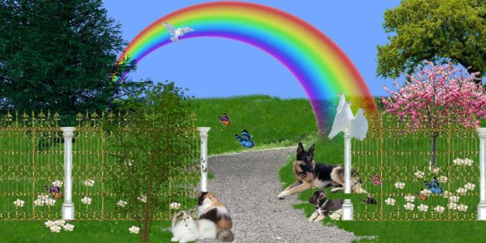 Just this side of heaven is a place called Rainbow Bridge. When an animal dies that has been especially close to someone here, that pet crosses the Rainbow Bridge. On the other side of the Rainbow Bridge, there are meadows and hills for all of our special friends so they can run and play together. There is plenty of food, water and sunshine and our friends are warm and comfortable.
