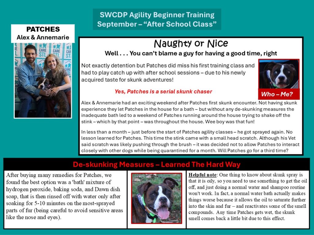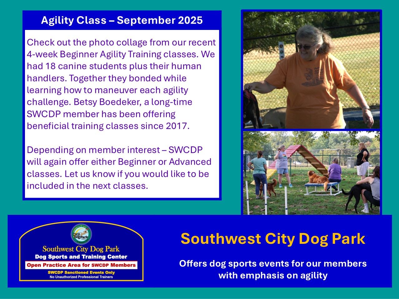 If this sounds good to you – SWCDP will offer another round of classes in October if we have enough member interest. There are limited slots – so if you want to provide your pup with this rewarding experience – please sign up now. There is a discounted training fee of $84.00 for 4 Saturday morning classes – and Betsy donates a portion back to SWCDP to help maintain our Dog Sports Center.