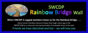 Most SWCDP canine members agree that they want to stay at their dog park forever. In fact, some of the humans have to coax, bribe or carry them out the gate when time to go home. These phenomena coupled with the many friendships, human and canine, formed within our wonderful dog park community led to the creation of SWCDP Rainbow Bridge Wall.
