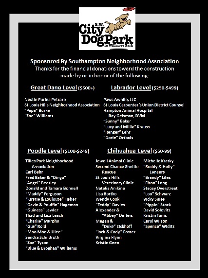 Another early task was to petition area residents and businesses, to ensure there were no major objections and to collect signatures of potential dog park users to demonstrate community interest in a dog park. SWCDP also received approval from Alderman Fred Heitert (Ward 12) and St Louis Hills Homeowners Association for the establishment of a dog park in Willmore Park.