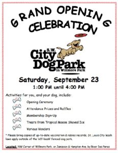 SWCDP opened its gates with great fanfare. The community was so excited and the turn-out was fantastic. So many smiling faces and wagging tails – the opening Day included visits from City Officials and Dignitaries and eager new members registering for membership. Everyone enjoyed the Fall day, the new playground, and special activities including raffles, prizes, and free treats provided by Tropical Moose Ice Shavings.