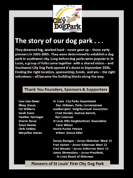 First a little backgroundIn 2003-2004, SWCDP founders Missy Krause, Cara Lyles-Baker and Pat Williams, and others, had a dream – they envisioned a green City space where their dogs and dog friends could play and run off leash – all within the safety of a fenced-in area. Why not look to St Louis City Parks for tapping a small patch of green space?