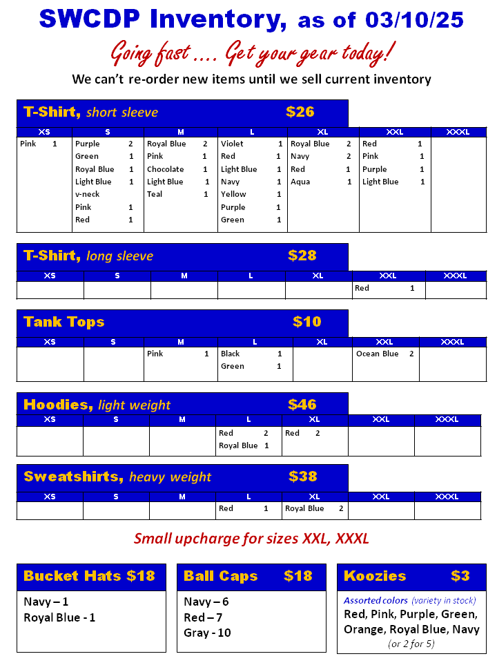 We will not be taking any special orders until we have cleared out current inventory. Plans for new SWCDP merch in 2026.